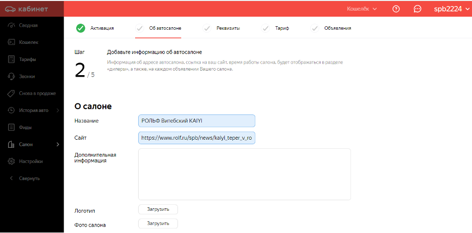 Как только кабинет активируют, вы окажетесь внутри. Сразу идете в раздел «О салоне». Там надо внести всю нужную информацию: название, сайт, адрес, телефон, время работы. Если собираетесь выставлять новые тачки, выбирайте бренд и загружайте документ, подтверждающий ваш дилерский статус.