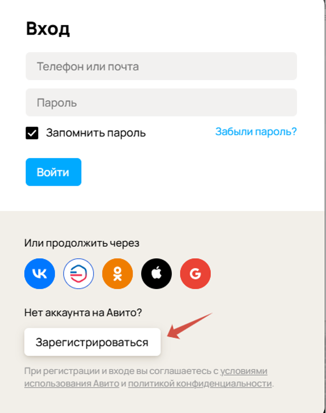 Перейдите на сайт Avito.ru и нажмите кнопку «Зарегистрироваться».